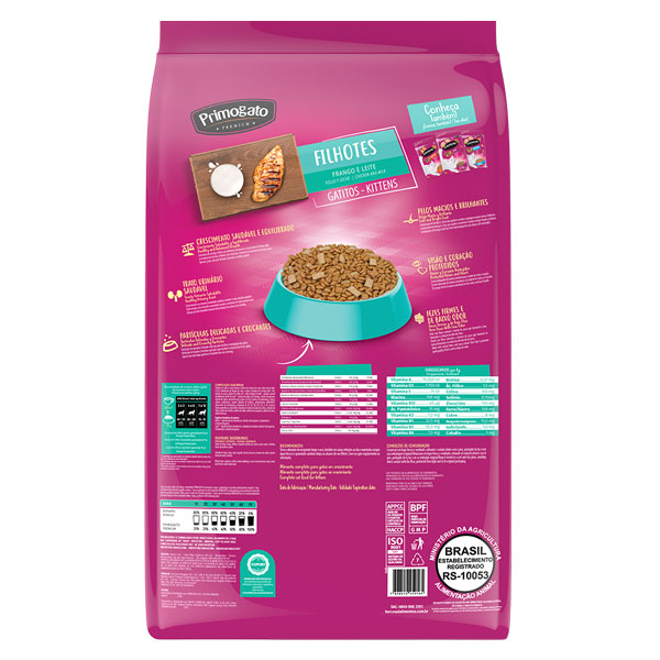 Primogato Premium Gatitos es un alimento 100% completo y balanceado que promueve el crecimiento saludable y equilibrado de los gatitos. Las partículas son delicadas y crujientes, especiales para facilitar la masticación. Además, ¡tiene nuggets rellenos muy sabrosos que los gatitos aman!