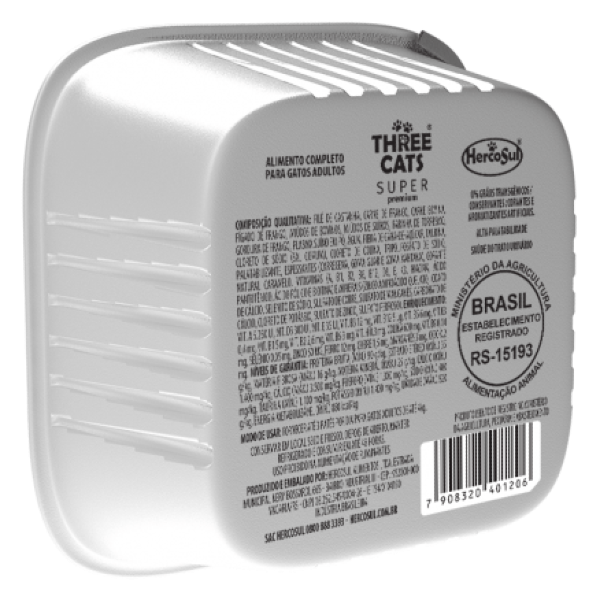 El paté Three Cats Super Premium Adultos sabor Pescado Blanco, Pollo y Carne es un alimento 100% completo y equilibrado, con cantidades adecuadas de minerales para favorecer la salud del tracto urinario felino. La combinación de proteínas tiene como resultado un sabor irresistible que satisface los paladares más exigentes. ¡Todo para que su gato disfrute de una comida segura, completa y saludable!