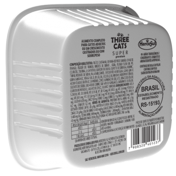 El paté Three Cats Super Premium Castrados – Bolas de Pelos es un alimento 100% completo y equilibrado con cantidades adecuadas de minerales para favorecer la salud del tracto urinario felino. El sabor pescado blanco, tiene bajas calorías y L-carnitina, lo que ayuda a controlar el peso de los animales castrados. Además, tiene fibras especiales que ayudan a eliminar los pelos ingeridos durante la limpieza diaria, evitando la formación de molestas bolas de pelo. ¡Todo para que su gato disfrute de una comida segura, completa y saludable!
