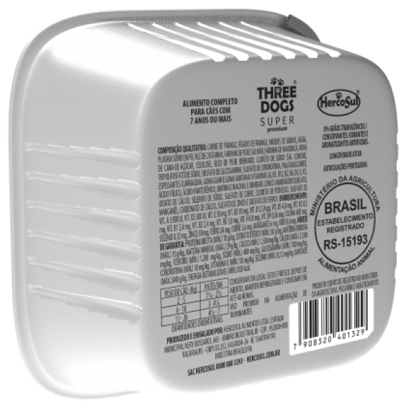 El paté Three Dogs Super Premium Senior 7+ Sabor Pollo es un alimento 100% completo y equilibrado con una fórmula rica en antioxidantes para promover la longevidad activa. Además, cuenta con glucosamina y condroitina en su composición, lo que favorece el mantenimiento de articulaciones sanas. Todo para que su mascota disfrute de una comida segura, completa y saludable.